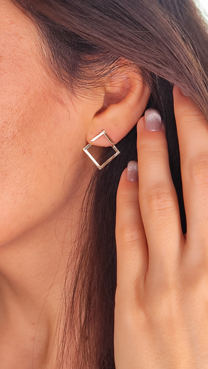 این گشواره طلا لوزی که به صورت دو تکه طراحی شده به طوری که لوزی کامل پشت لاله گوش قرار میگیرد و قسمت کوچک تر میخی جلو لاله گوش قرار میگیرد