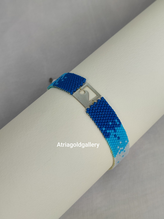 این دستبند میوکی با پلاک نقره طرح موج از منجوق های میوکی اصل ژاپنی ساخته شده در گالری طلا آتریا قابل سفارش است