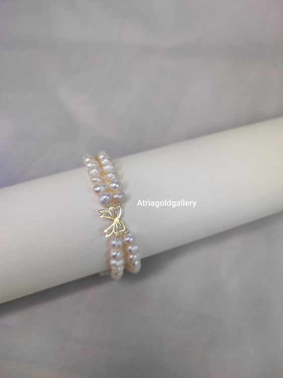 این دستبند طلا با پلاک طرح پاپیون با مروارید پرورشی ساخته که در گالری طلا آتریا قابل سفارش است