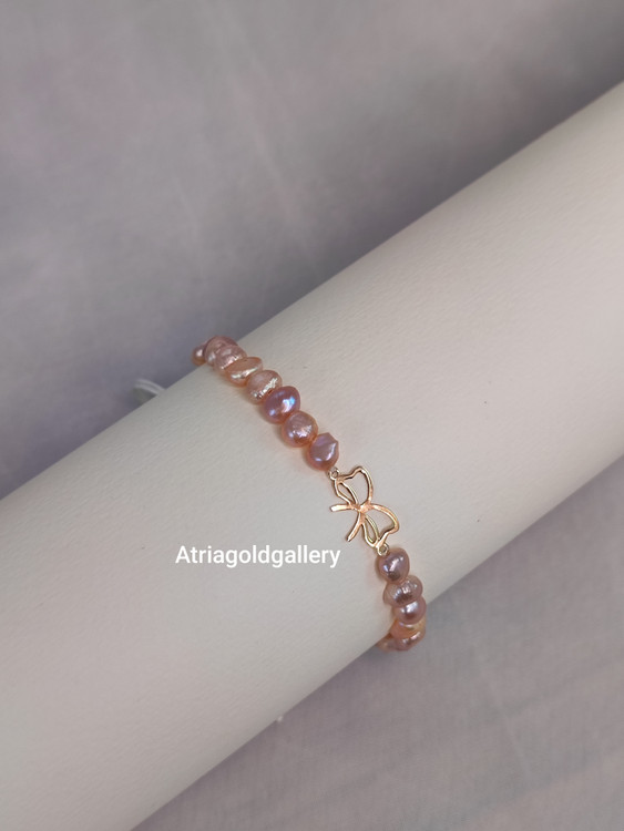 این دستبند طلا با مروارید پرورشی رنگ صورتی ساخته شده